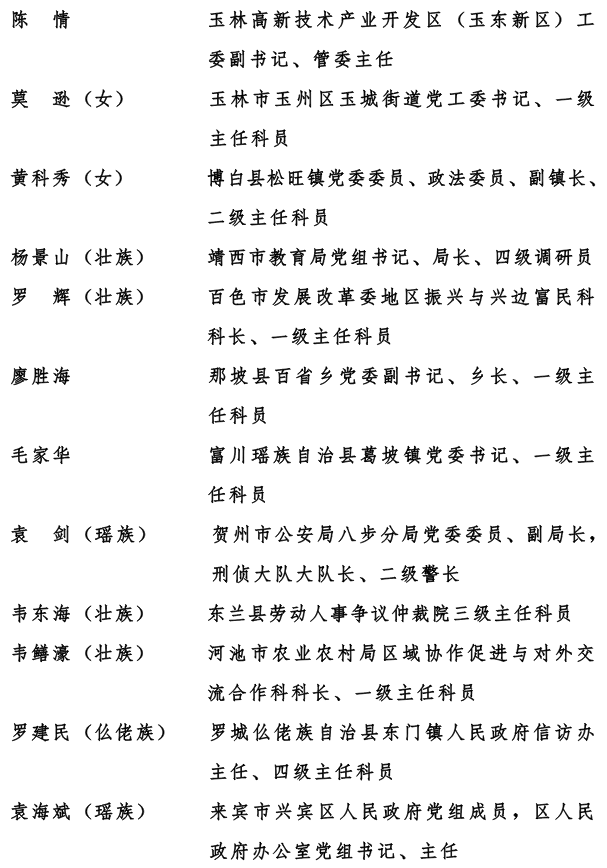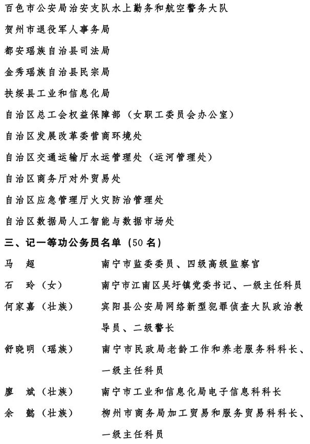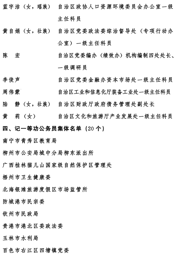 在“十四五”顺利收官、“十五五”开局起步之际,为表彰先进、树立典型,激励全区公务员和公务员集体奋进新征程、建功新时代,自治区党委、自治区人民政府决定,授予毕雯等40名同志全区“人民满意的公务员”称号,授予南宁市良庆区良庆镇人民政府等20个集体全区“人民满意的公务员集体”称号,给予马超等50名同志、南宁市青秀区教育局等20个集体记一等功。被授予全区“人民满意的公务员”称号的个人,享受省部级表彰奖励获得者待遇。