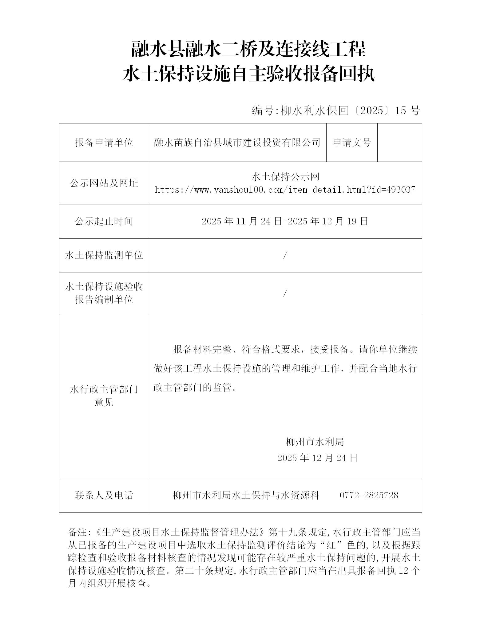 融水县融水二桥及连接线工程水土保持设施自主验收报备回执(柳水利水保回【2025】15号)