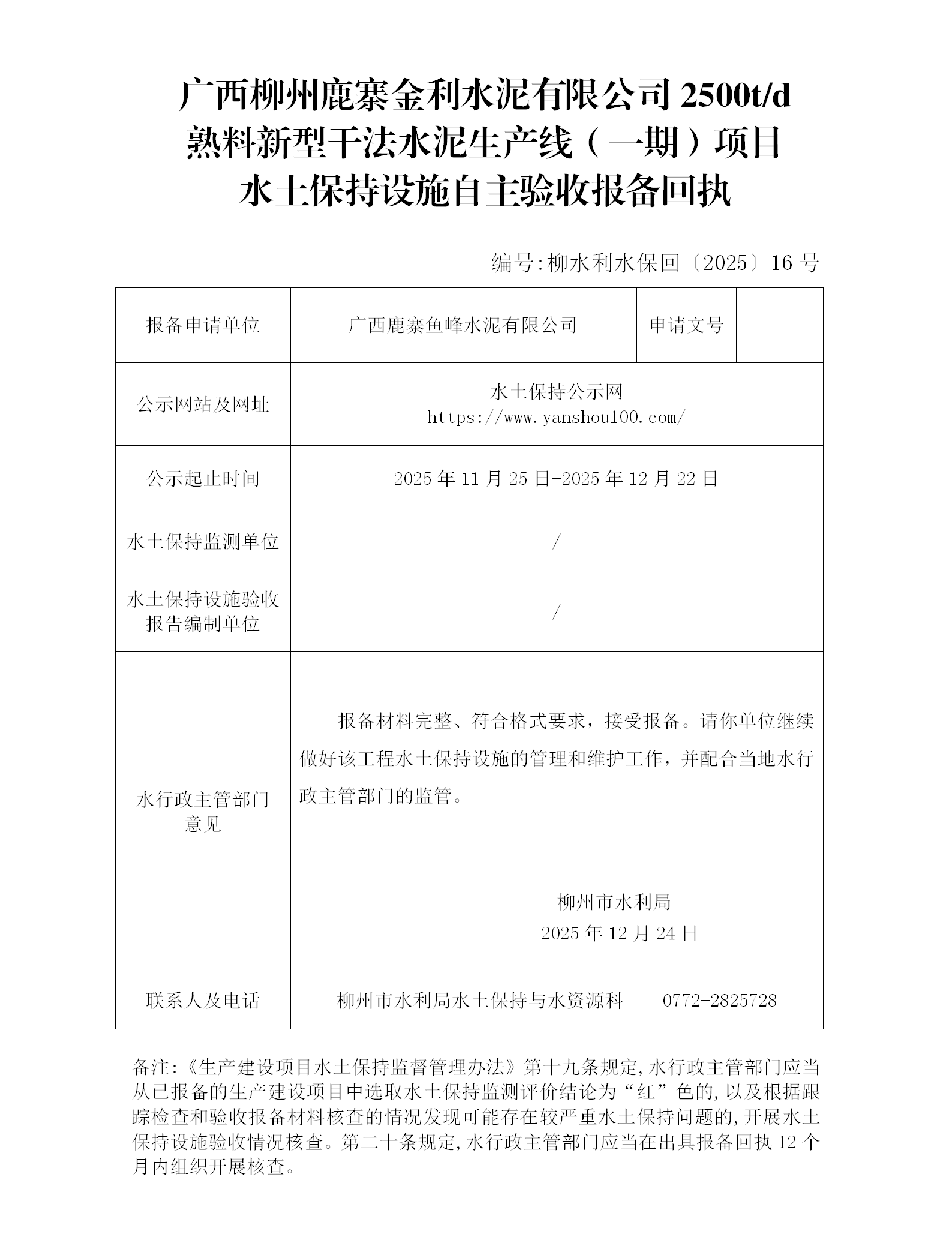 广西柳州鹿寨金利水泥有限公司2500td熟料新型干法水泥生产线(一期)项目水土保持设施自主验收报备回执(柳水利水保回【2025】16号)