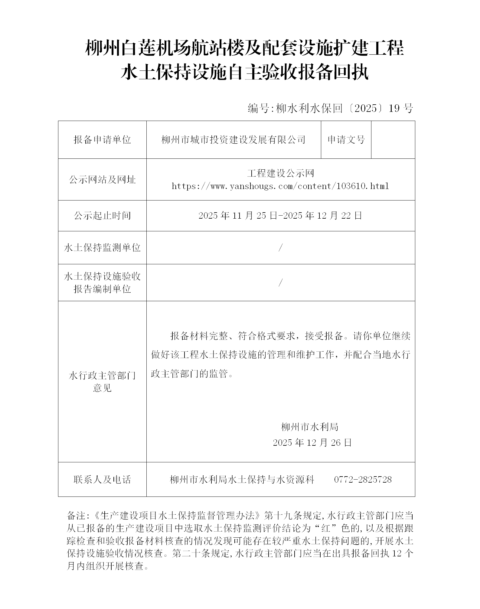 柳州白莲机场航站楼及配套设施扩建工程水土保持设施自主验收报备回执(柳水利水保回【2025】19号)