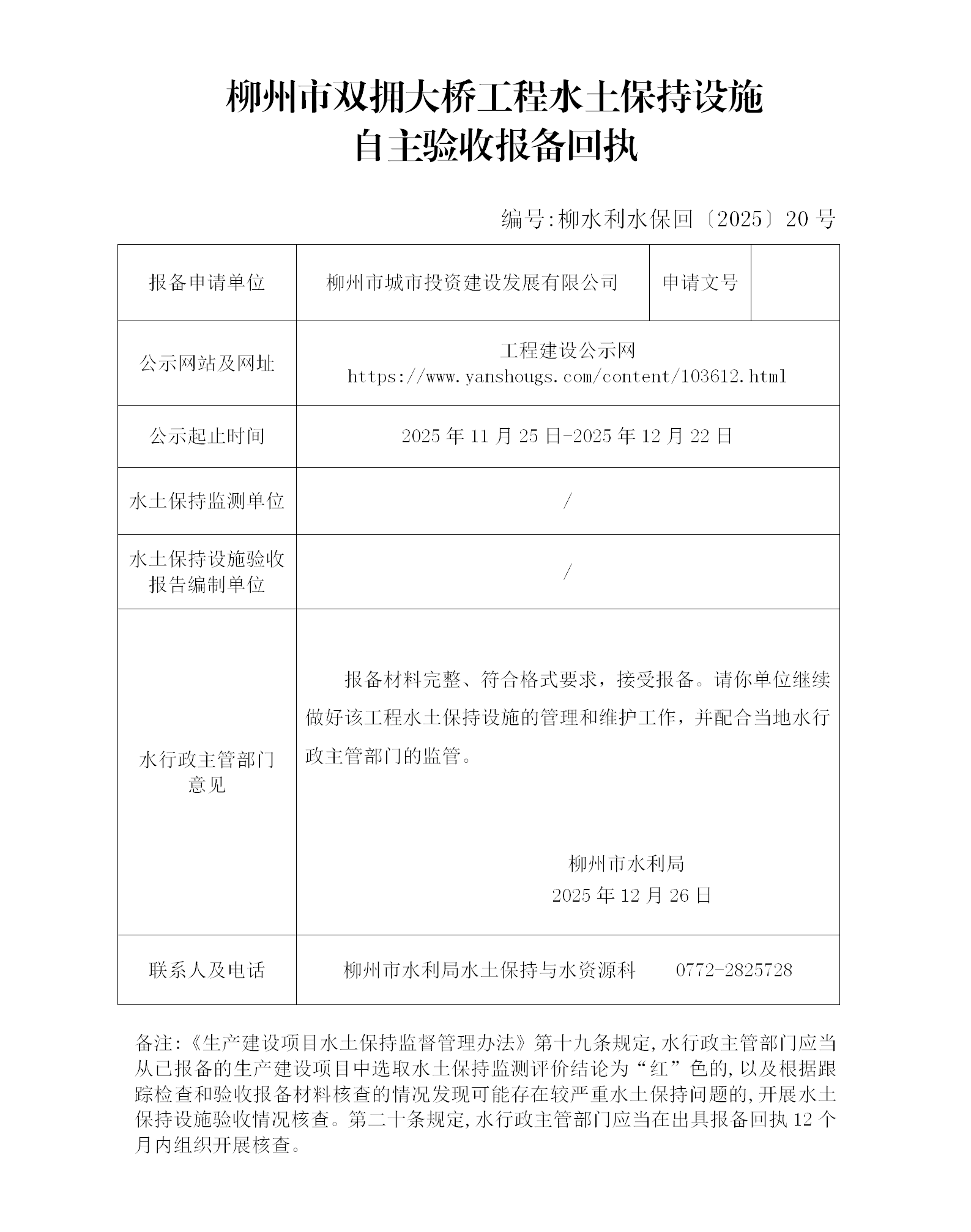 柳州市双拥大桥工程水土保持设施自主验收报备回执(柳水利水保回【2025】20号)