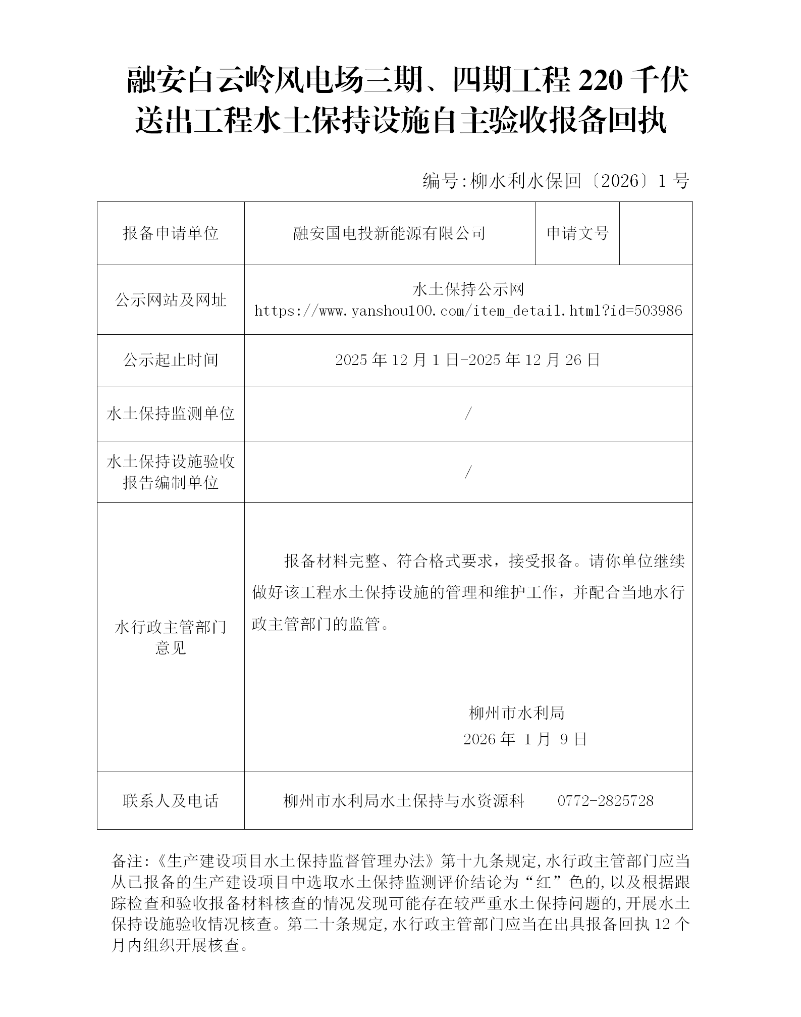 融安白云岭风电场三期、四期工程220千伏送出工程水土保持设施自主验收报备回执(柳水利水保回〔2026〕1号)