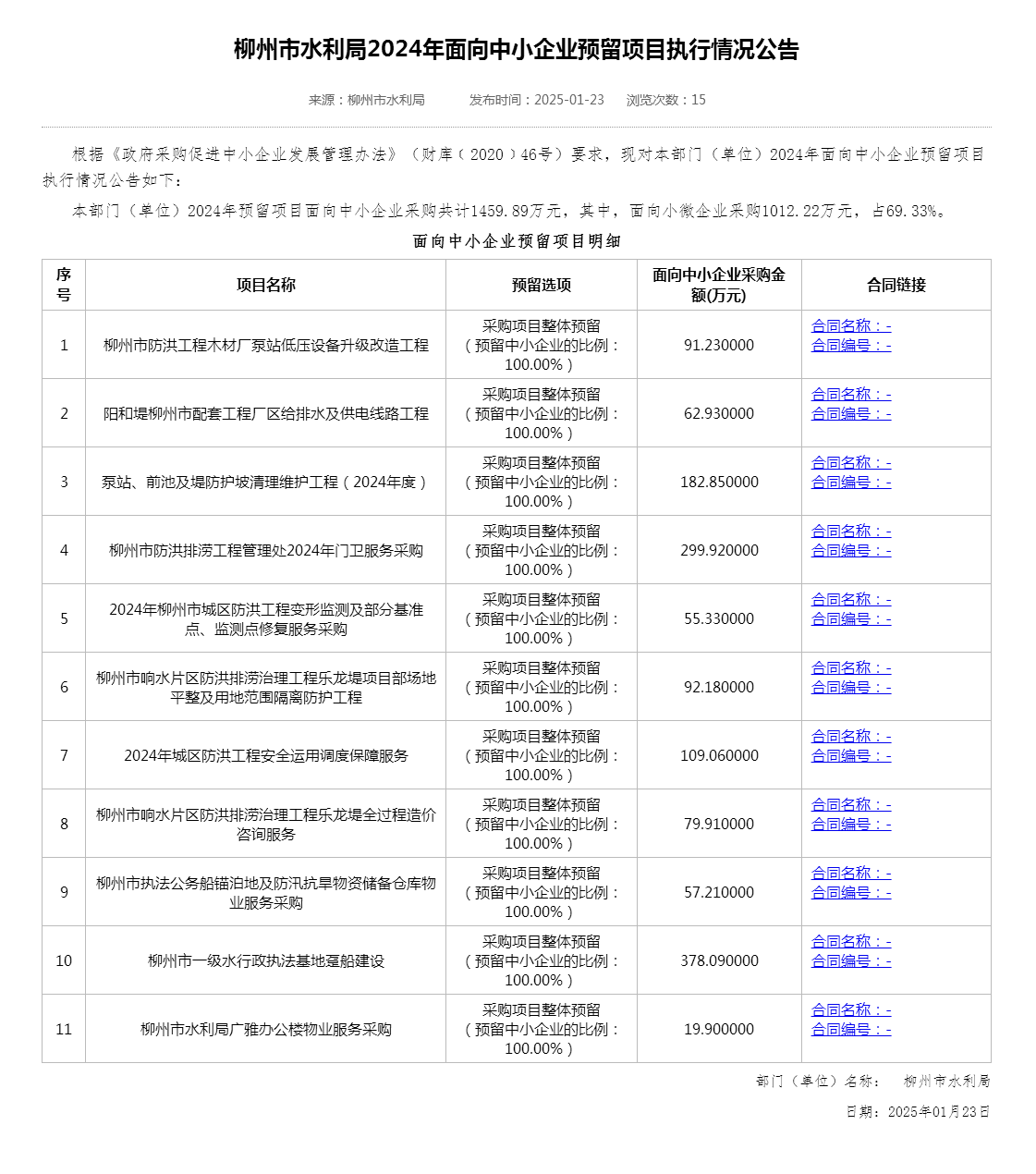 柳州市水利局2024年面向中小企业预留项目执行情况公告