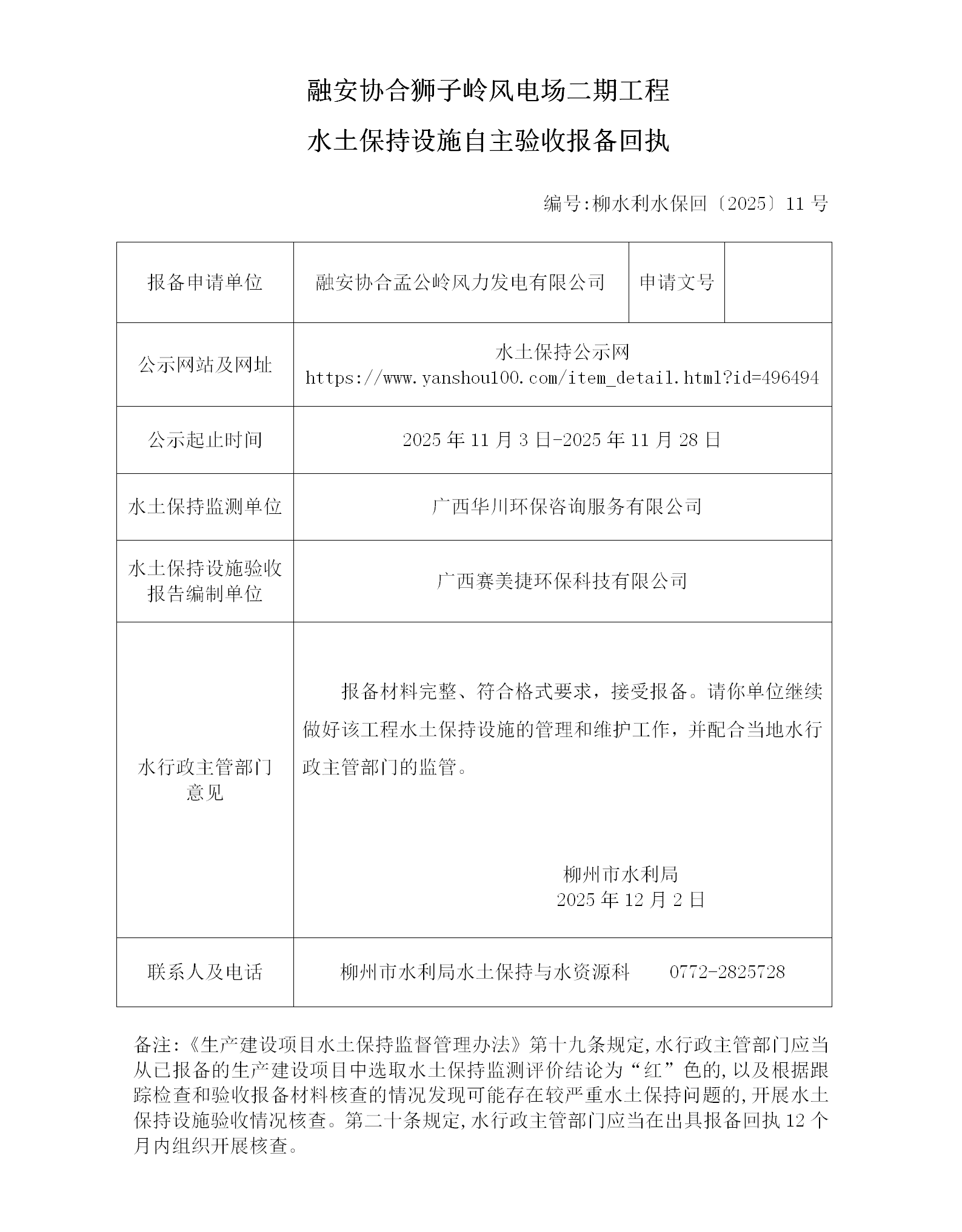 融安协合狮子岭风电场二期工程水土保持设施自主验收报备回执(柳水利水保回【2025】11号)