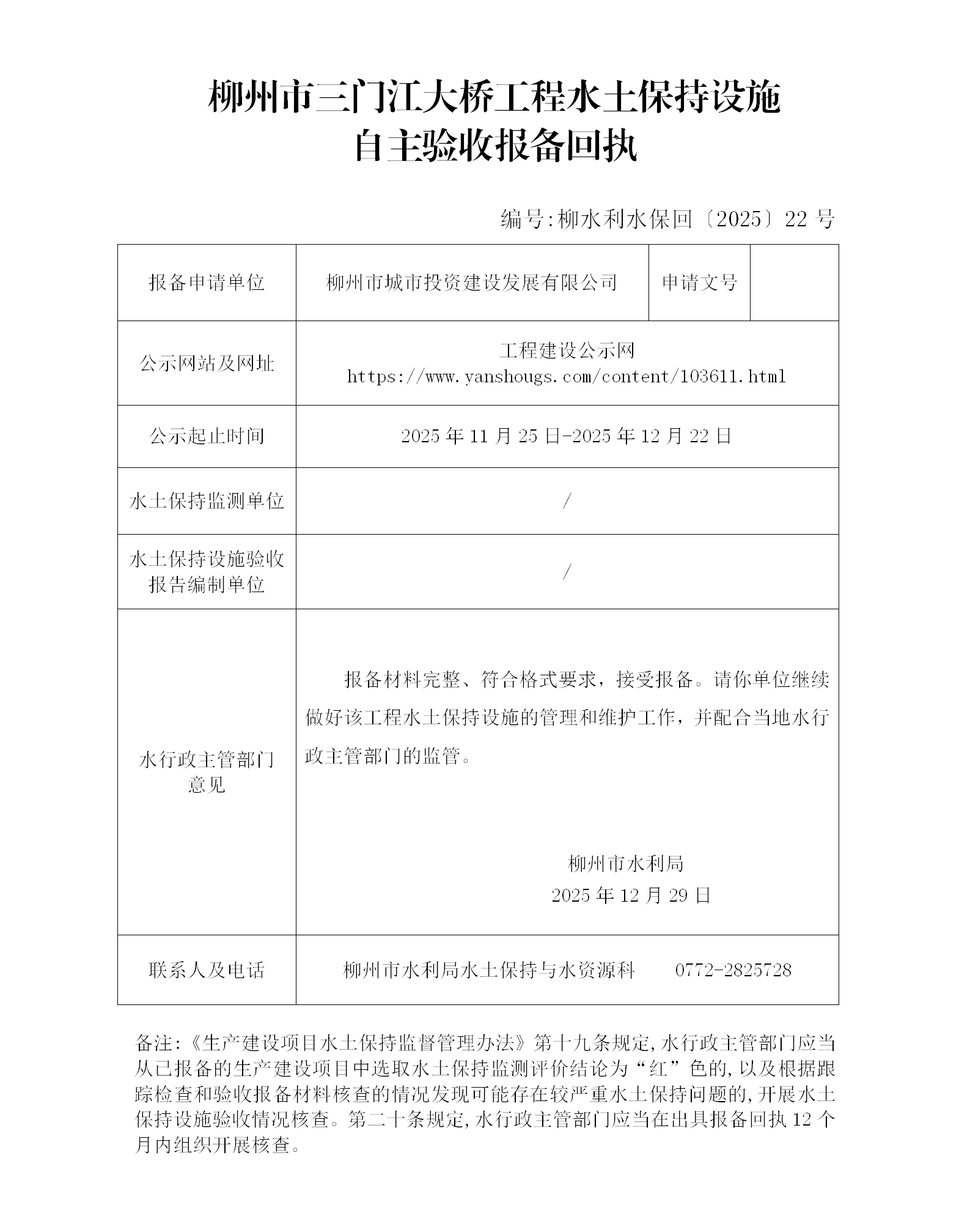 柳州市三门江大桥工程水土保持设施自主验收报备回执(柳水利水保回【2025】22号)